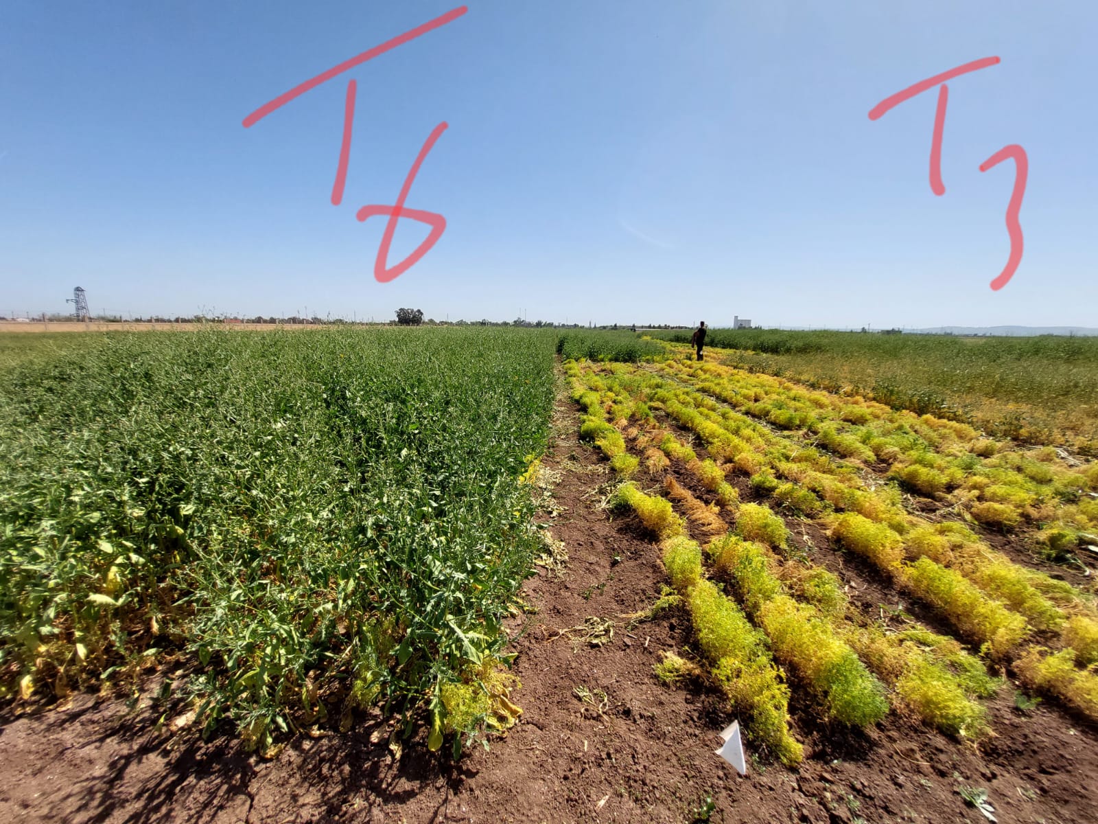 Vues des essais d’évaluation de diverses stratégies de contrôle des adventices des légumineuses alimentaires (pois chiche et lentille) en agriculture de conservation. Les essais sont installés dans la station expérimentale de Sidi El Aydi du Centre Régional de l’Institut National de la Recherche Agronomique à Settat (Maroc).