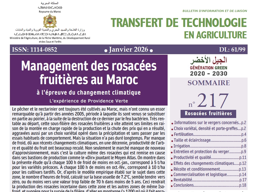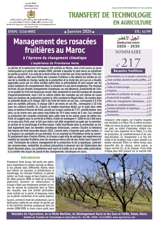 Le pêcher et le nectarinier ont toujours été cultivés au Maroc, mais n’ont connu un essor remarquable qu’à partir de 2005, période à laquelle ils sont venus se substituer en partie au poirier, à la suite de la destruction de ce dernier par le feu bactérien. Très rentable au départ, cette sous-filière des rosacées fruitières a vite atteint ses limites en raison de la montée en charge rapide de la production et la chute des prix qui en a résulté, aggravées aussi par un choix variétal opéré dans la précipitation et sans passer par les essais habituels de comportement. Mais la situation n’a pas duré longtemps. Par manque de froid, dû aux récents changements climatiques, en une décennie, productivité de l’arbre et qualité du fruit ont beaucoup reculé. Non seulement le marché manque de nouveau d’approvisionnement, mais c’est la culture même des rosacées qui est remise en cause dans ses bastions de production comme le «Dir» jouxtant le Moyen Atlas. On montre dans la présente étude qu’à chaque 100 h de froid de moins en oct.-jan., correspond à une baisse de 5 t/ha pour les variétés précoces et à chaque 100 h de moins en oct.-fév., correspond à moins 10 t/ha pour les cultivars tardifs. Or, d’après le modèle empirique établi sur le sujet dans cette zone, le nombre d’heures de froid, calculé sur la base usuelle de 7,2°C, semble tendre vers zéro, ou du moins vers une valeur trop faible de 70 h dans moins de 5 ans. Ceci rendrait la production des rosacées incertaine dans cette zone et les autres zones de même Iso-froid, et suggère pour la survie de la filière, d’aller en montagne (> 1200 m) où il fait encore un peu plus froid, sachant que celle-ci est déjà largement occupée par le pommier, le cerisier et le maraîchage d’arrière-saison. Comme dans n’importe quel autre secteur, il y a toujours un «sortant» et «un entrant». En un moment où Providence Verte se convertit amplement dans d’autres filières, le Groupe a jugé utile de partager son expérience en matière de rosacées fruitières avec les nouveaux–venus afin de leur éviter tout risque d’écueil. Techniques de culture, management de la production et de la logistique, contraintes commerciales, rentabilité, et surtout précautions à observer lors de l’élaboration des futurs Business plans. Les problèmes sont repris et traités un à un dans cette publication, à la lumière des acquis du passé et des changements climatiques en cours.