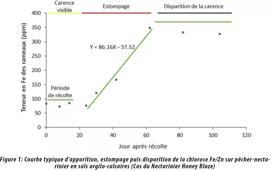 Figure 1: Courbe typique d’apparition, estompage puis disparition de la chlorose Fe/Zn sur pêcher-nectarinier en sols argilo-calcaires (Cas du Nectarinier Honey Blaze)