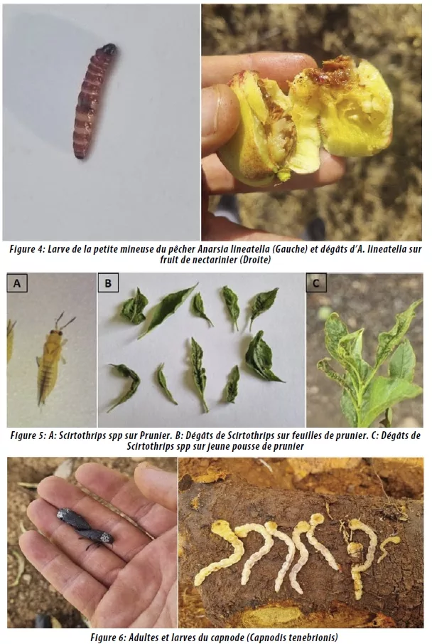 La petite mineuse du pêcher (Anarsia lineatella) figure parmi les ravageurs majeurs des pêches et nectarines de saison et tardives dans la plaine de Saïs et le Moyen Atlas (Figure 4). La lutte contre ce déprédateur repose sur l’utilisation du Biofix et du calcul des degrés-jours. En général, une à deux applications d’insecticide, réalisées entre 150 et 200 degrés-jours après le premier et le deuxième Biofix, suffisent à prévenir les dégâts. La surveillance s’effectue à l’aide de pièges à phéromone spécifique, installés à raison d’un piège pour 4 ha, et contrôlés trois fois par semaine, du mi-février à fin septembre. Les essais de lutte ont montré que, parmi les molécules homologuées sur pêcher-nectarinier, le Cyantraniliprole, appliqué à 40 cc de PC/hL, est efficace contre ce ravageur.