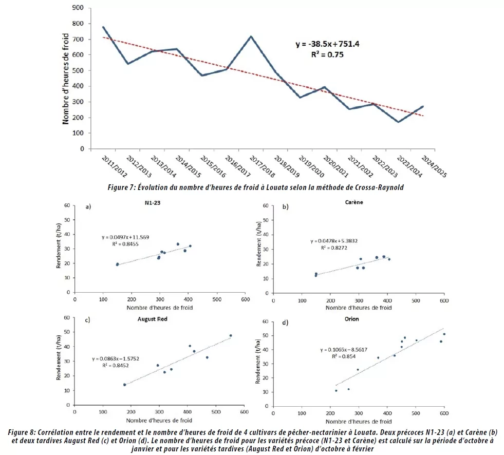 En admettant la validité des prédictions de ce modèle et en retenant l’hypothèse, largement partagée, d’une poursuite du réchauffement climatique — avec une probabilité faible d’un renversement de tendance à court terme — une part importante des variétés actuellement cultivées de rosacées (abricotier, prunier de séchage, pêcher-nectarinier, poirier), ou présentant des besoins en froid similaires à celles testées, pourrait ne plus être adaptée aux conditions du Dir du Saïs, l’un des principaux pôles de production au Maroc.
