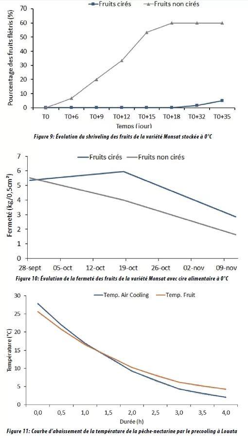 Au nord, c’est-à-dire Louata, Chlihat I et Chlihat II, surproduction et faibles prix sur le marché local au bout de quelques années, nous ont amenés de nouveau à reprendre l’Export, après avoir été rassurés par nos clients Agrumes, que des possibilités de mieux valoriser la production à l’étranger existent. Sauf que le fruit de la pêche/nectarine est très fragile et n’a rien à voir avec celui des agrumes. Les marchés de l’Europe, voire celui de la Russie sont livrables par camion dans les délais fixés par le cahier des charges, par contre, c’est sur les destinations plus lointaines livrées par bateau et non envisageables par avion pour des impératifs de coût, comme l’Amérique du Nord, qu’il a fallu des dispositions draconiennes pour que le fruit arrive à l’état frais sur les rayons. Il faut une cueillette tôt le matin à une fermeté stricte de 5,5-6 (1), un transfert immédiat vers la station (2), trempage 10-15 minutes dans le fongicide (3), passage au precooling pendant 4h (Figure 11) pour ramener la température du fruit à 4°C. Ensuite entreposage au frigo à 0-1°C, conditionnement et application de l’enrobage alimentaire (5) et enfin, expédition par container, fruit toujours maintenu à 0-1°C, sans oublier le principe du First in-First out pour la gestion de l’entreposage une fois sur place. D’importantes recherches ont été menées au sein du Groupe en particulier sur la cire alimentaire. Les résultats présentés dans les figures 9 et 10 confirment l’efficacité remarquable de cet enrobage sur la qualité de la peau et la tenue du fruit. Malheureusement, ils ont été établis après la décision d’arrêter définitivement l’export, ce qui en a limité la portée pratique et la valorisation sur le plan commercial.