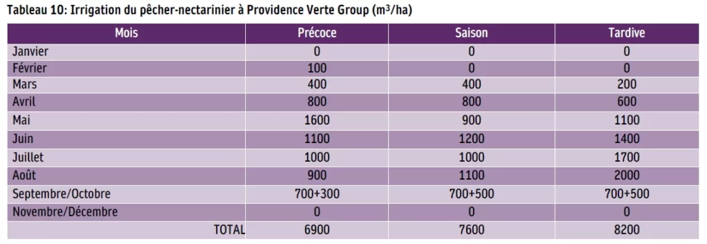 Tableau 10: Irrigation du pêcher-nectarinier à Providence Verte Group (m3/ha)