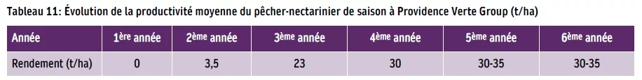 D’une manière générale et sauf facteur limitant, bien qu’évoluant en dents de scie, d’une année sur l’autre, en moyenne, les rendements réalisés sur pêcher-nectarinier à Providence Verte Group, tournent autour de 15-20 t/ha pour les extra-précoces cultivées sous filet, 25-30 t/ha pour les précoces de plein air, 30-35 t/ha pour les variétés de saison et 35-45 t/ha pour les très productives de saison ou tardives comme Bénédicte, Émeraude, Zephyr, Orion et Corindon.