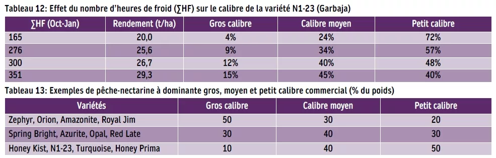 Le calibre est également très sensible au nombre d’heures de froid cumulées. Sur N1-23 (Garbaja), à un niveau faible de cumul de froid (∑Nhf≈ 160 h), le profil de calibre produit est à hauteur de 75 % du petit calibre contre 4 % de gros calibre et 24 % de moyen calibre, tandis qu’à ∑Nhf≈ 350h, le gros et le moyen calibre représentent 60 % de la récolte (Tableau 12).