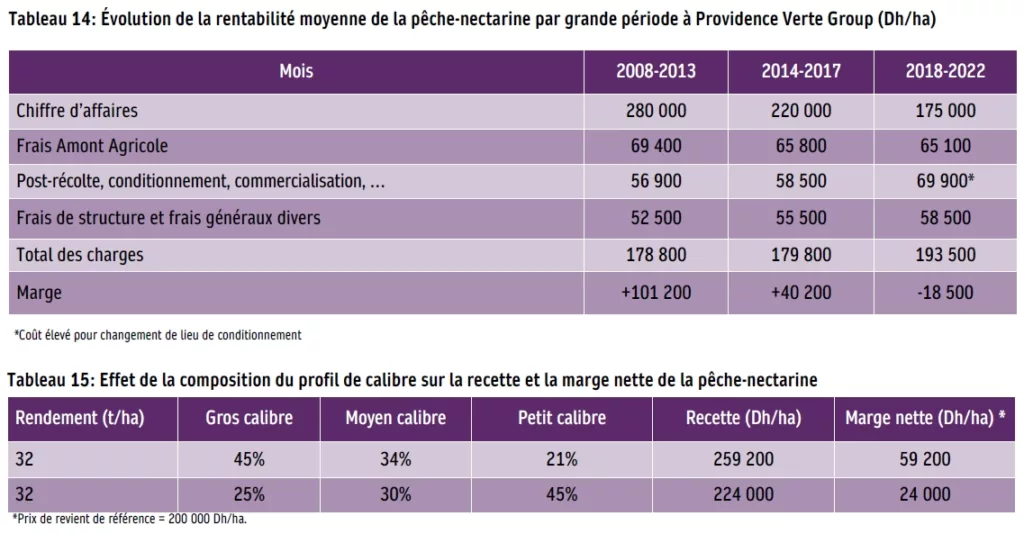 D’après les archives du Groupe, il faut entre 400 000 et 500 000 Dh pour créer un ha de verger de pêcher-nectarinier sous filet avec structure métallique et environ la moitié de ce montant pour une production de plein air. Chiffres anciens d’à peu près 15-20 ans, qu’il faudrait certainement actualiser. Comme coût de production un peu plus récent (Tableau 14), il faut entre 190 000 et 195 000 Dh/ha dont environ 65 000 à 70 000 pour l’amont agricole cueillette comprise, le reste pour couvrir les frais de conditionnement, la logistique de transport, la commercialisation, les commissions sur vente (au total 56 000-70 000 Dh), les frais de structure et généraux divers (52 000-58 000 Dh).