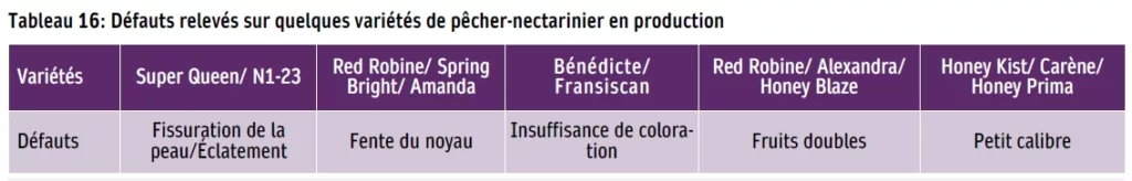 Comme on peut le constater sur le tableau 16 des défauts, à Louata, Super Queen, Red Robine, Spring Bright, Bénédicte, Fransiscan, Honey Kist, Carène, mais d’autres aussi, en sont des exemples. Mais entre Chlihat I et II, Honey Prima, Royal Queen, Bighaven, Honey Blaze, Onyx et Amanda, n’ont pas été un grand succès non plus, auxquelles il faut ajouter les pêches et les nectarines plates Oriane, Ordigan, Ornella, Mesembrine et Oriola, non prisées sur le marché local et arrachées aussitôt leur entrée en production.