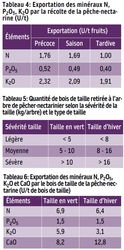 Tableau 4: Exportation des minéraux N, P2O5, K2O par la récolte de la pêche-nectarine (U/t)