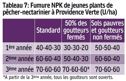 Au-delà des expérimentations, après 20-30 ans de pratique sur le terrain, la fertilisation des rosacées, y compris le pêcher-nectarinier, nous semble aujourd’hui largement maitrisée et figée au sein du Groupe. Pour les jeunes plants, l’approche générale, est d’obtenir rapidement une bonne frondaison et un bon potentiel de production. Ceux-ci sont «dopés» quelque peu les 2-3 premières années, au prix d’un certain enrichissement PK du milieu, mais sans polluer l’environnement, récupérable par la suite, en diminuant la dose à l’âge adulte. Inversement, en goutte à goutte, la dose NPK au stade jeune, est aussi susceptible de réduction de 20-30 % si la décision a été prise de fermer les goutteurs éloignés des racines, à moins d’envisager la culture intercalaire entre les jeunes arbres; pratique courante sur d’autres espèces comme l’avocatier ou les agrumes, mais plutôt rare en verger de rosacées fruitières. Le tableau 7 donne les doses NPK (en unités/ha) habituellement appliquées au sein du Groupe sur pêcher-nectarinier.