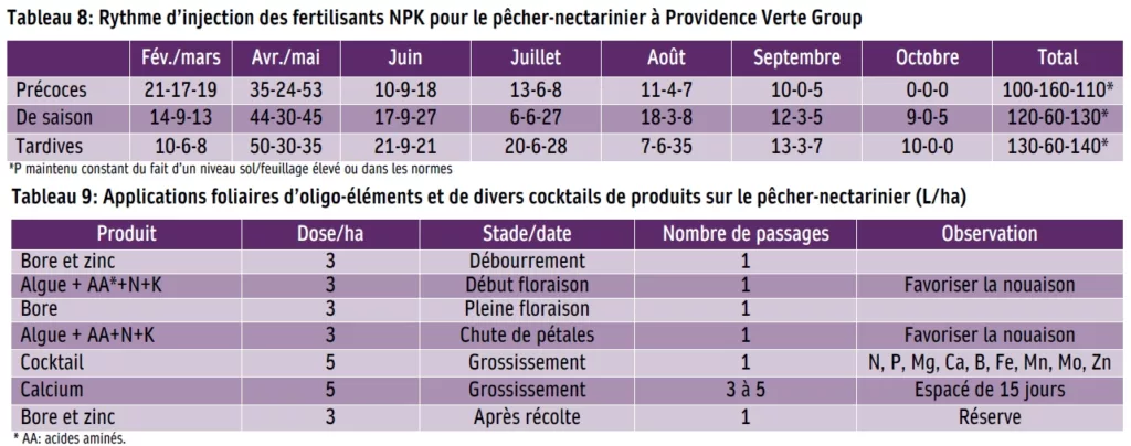 Cultivé sur sols calcaires et/ou à pH alcalin, le pêcher–nectarinier, comme les autres espèces fruitières, bénéficient en préventif, de façon systématique, entre mars et juin, d’application de fer type EDDHA au pied de l’arbre à raison de 10 g/arbre, 1 à 3 fois selon le degré de carence constaté. Le verger bénéficie aussi de divers cocktails d’oligo-éléments seuls ou en mélange avec NPK, NPK + acides aminés ou encore d’application de calcium durant le grossissement du fruit (Tableau 9).